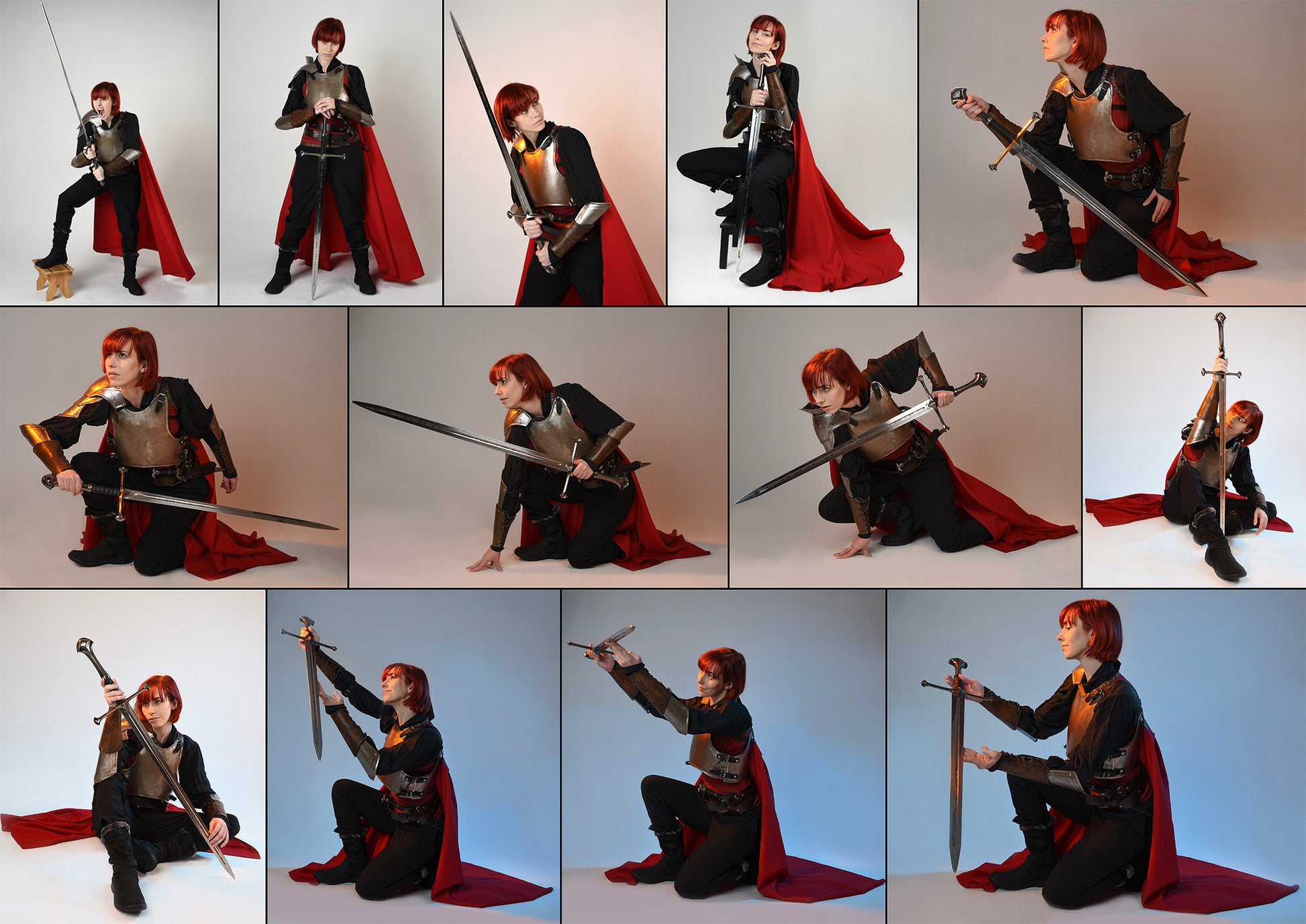 Each image features the model wielding a sword in a wide range of action and dramatic poses, set against diverse studio backgrounds— dark black silhouettes, classic white, and golden cinematic lighting reminiscent of a sunset or fire.