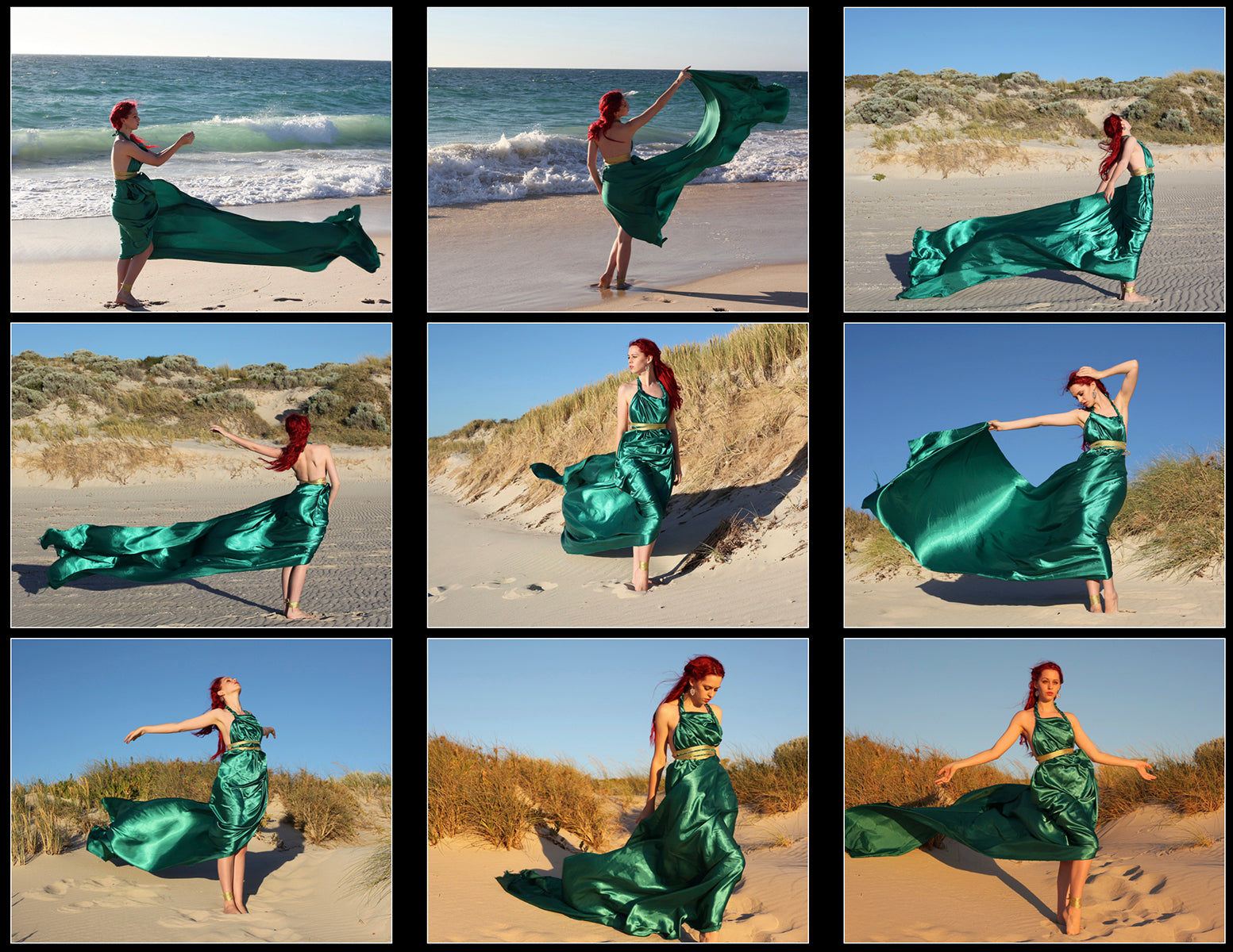 These are all self portraits in 6 different outfits, including long silken gowns like a Ancient Greek goddess with glowing golden lighting and back lit sunset silhouettes.