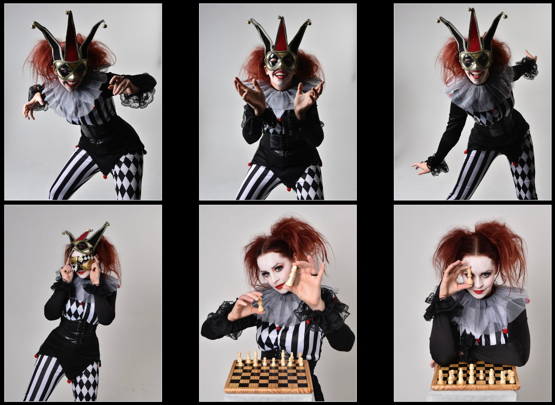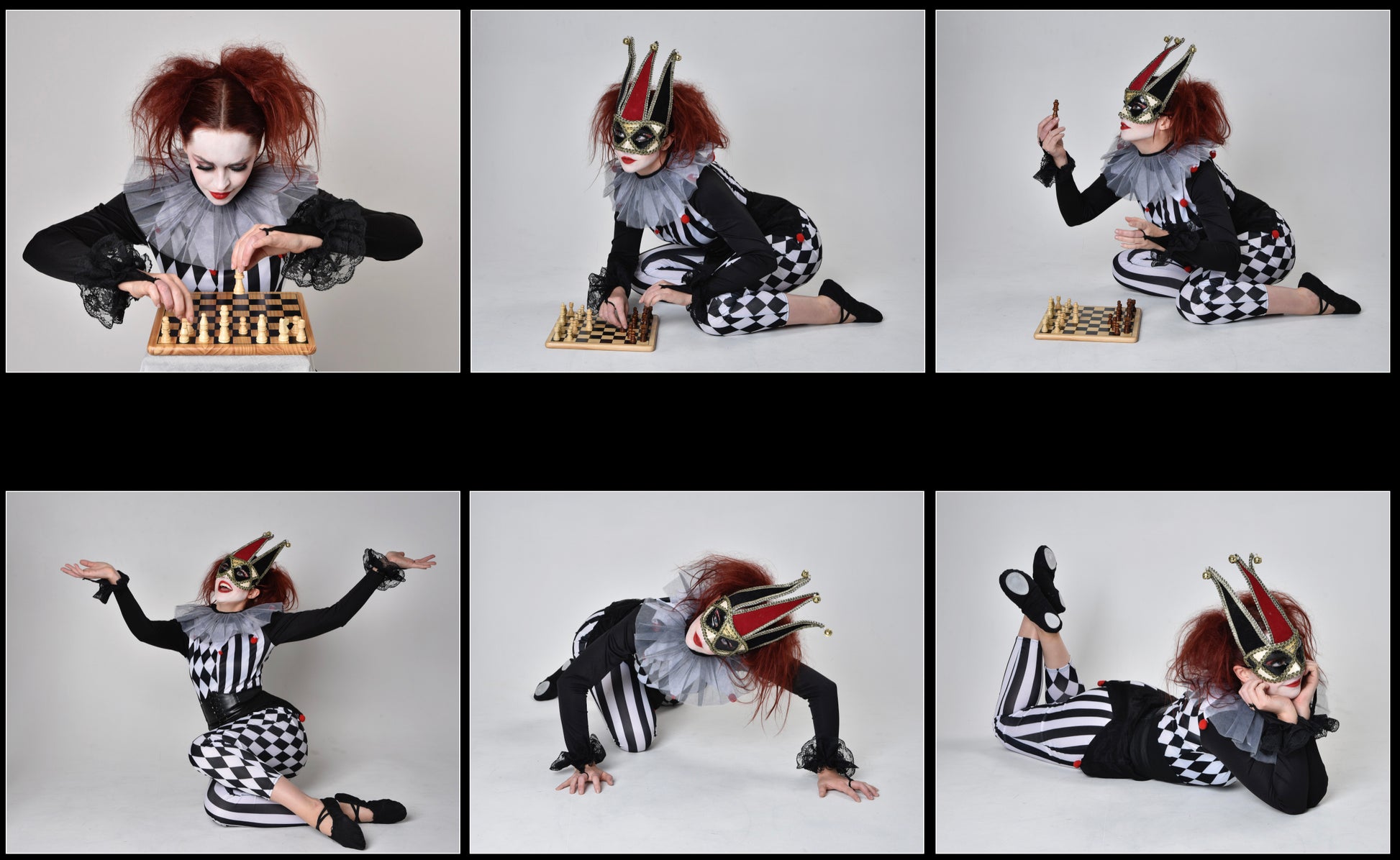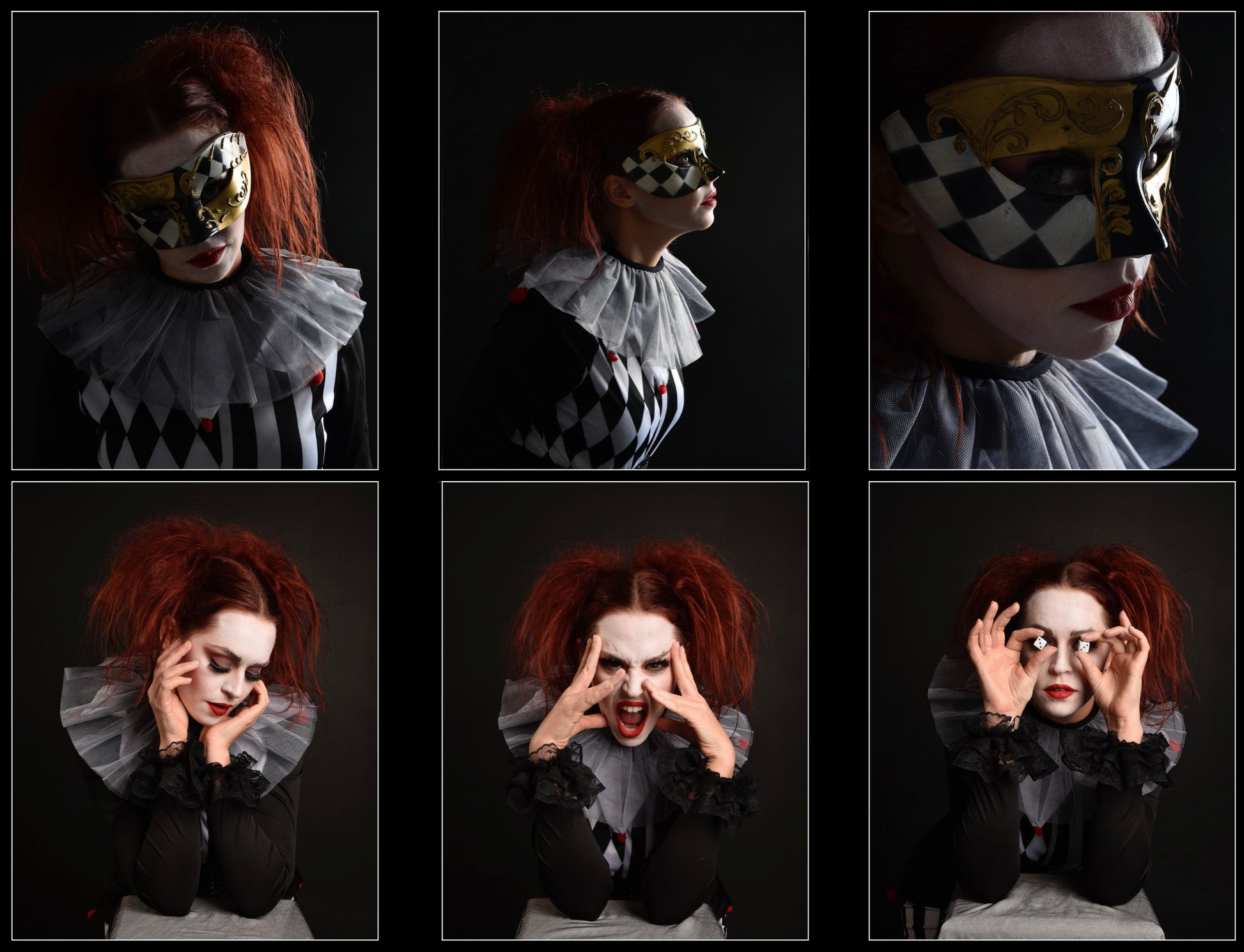 x130 high resolution self portraits with wearing a black and white jester/ circus clown inspired costume.