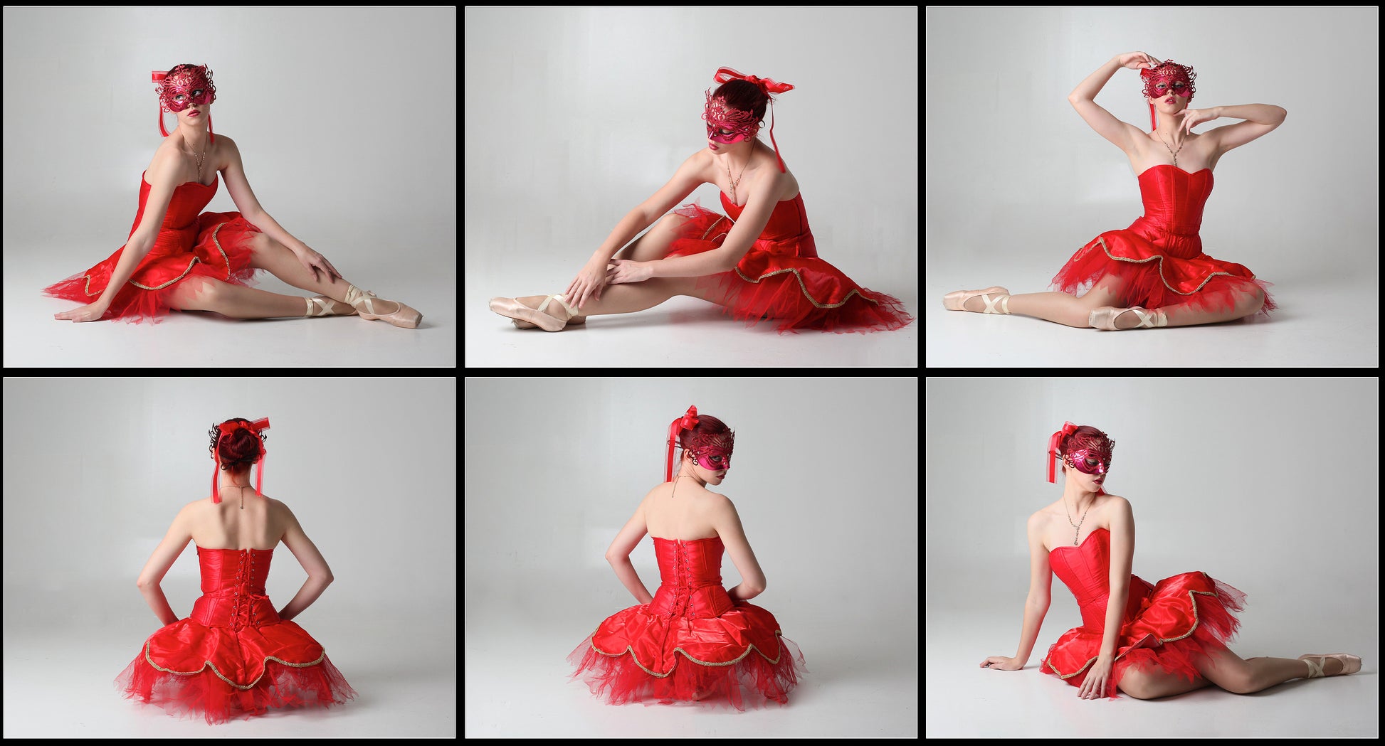 x73 self portraits wearing a red ballet dancer tutu costume with a mask.