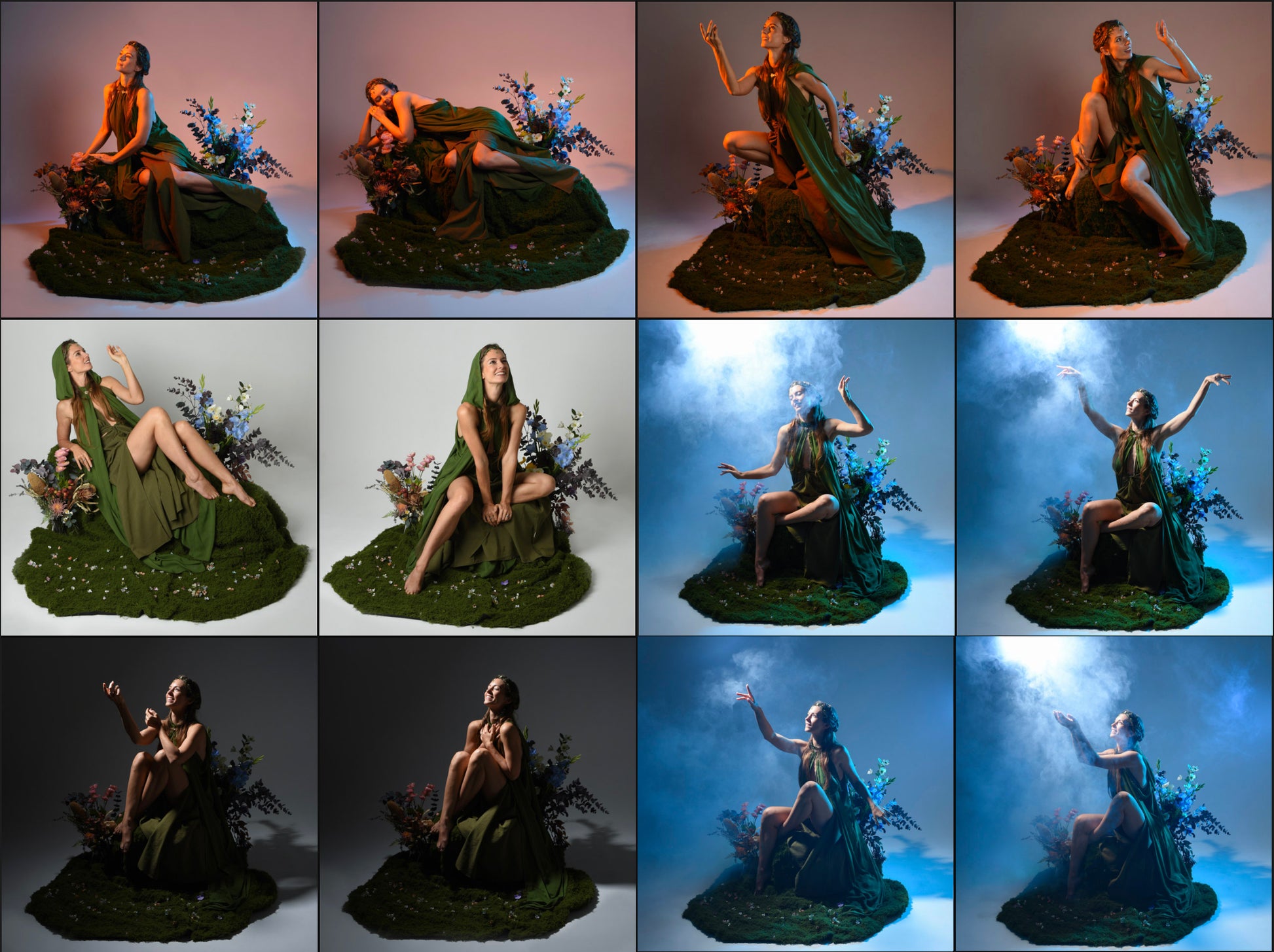 Styled as a mystical elven character, the images are enhanced with moody, cinematic lighting, backlit silhouettes with misty smoke effects to create a richly atmospheric, ethereal mood.