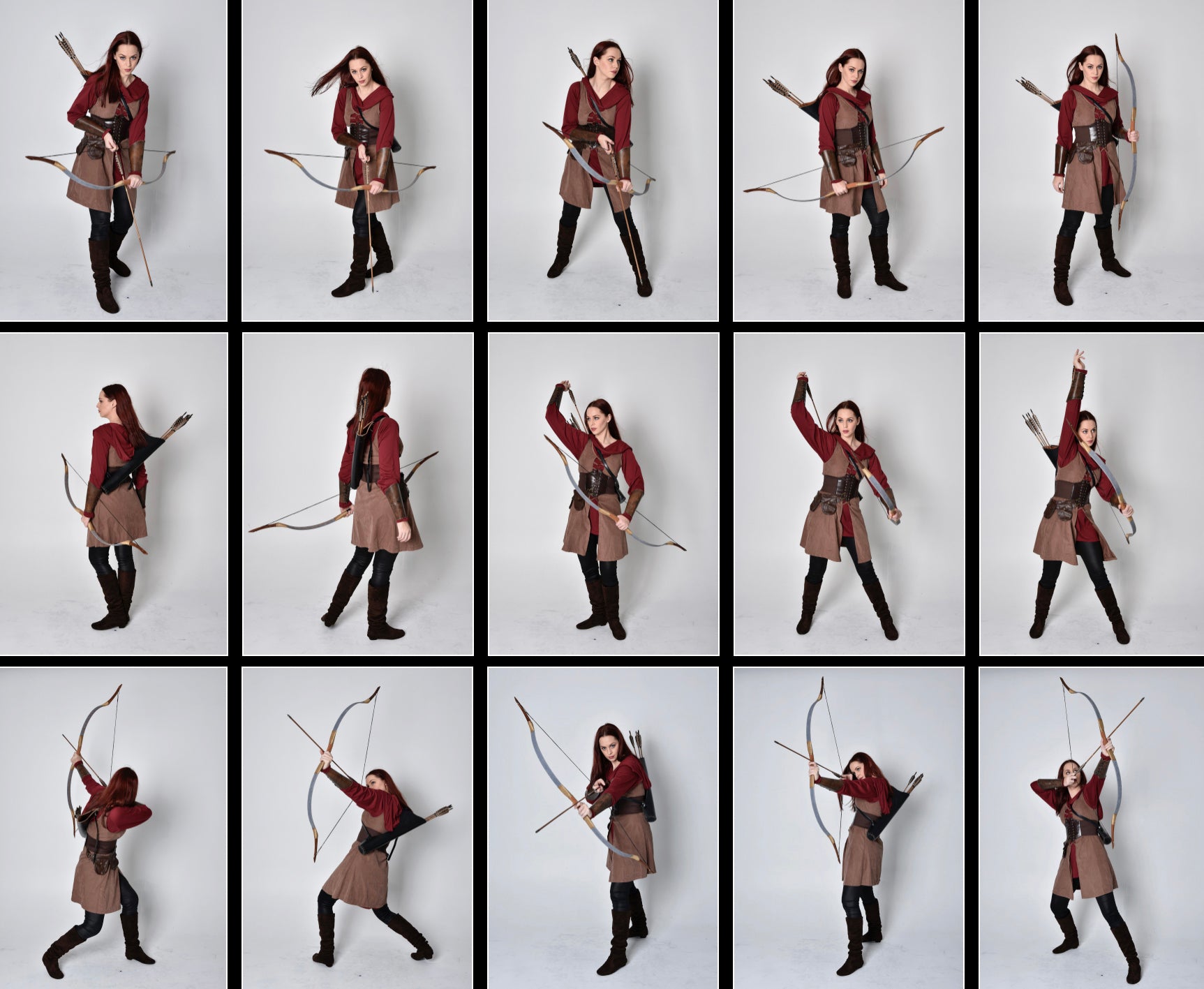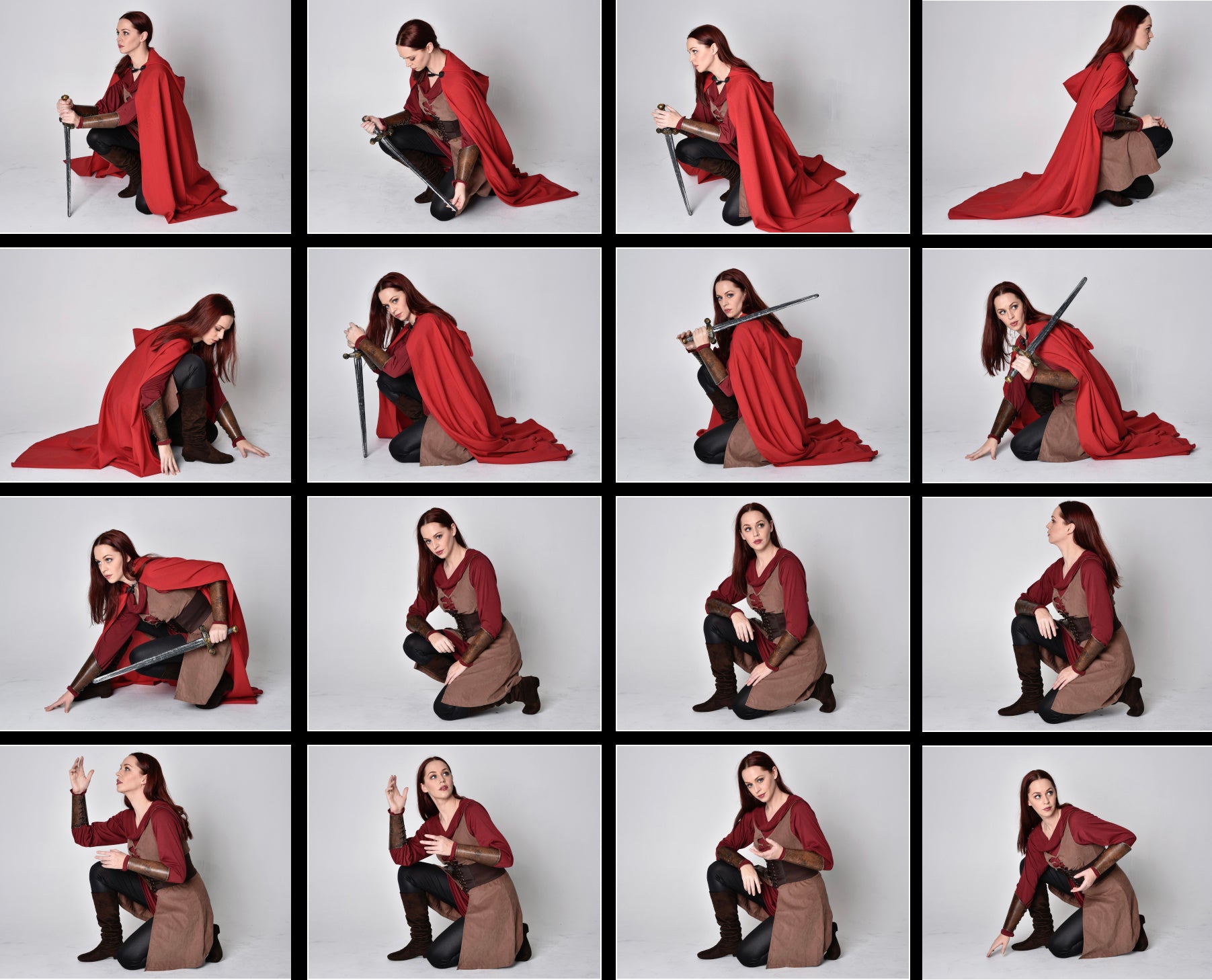 This character is inspired by heroines from classical fantasy stories and Dungeons & Dragons style adventurers. The pack features 200 dynamic studio based self-portraits in a fantasy medieval inspired warrior costume with red and black cloaks, wielding swords and bows, with expressive stances and movement that capture the essence of a skilled warrior.