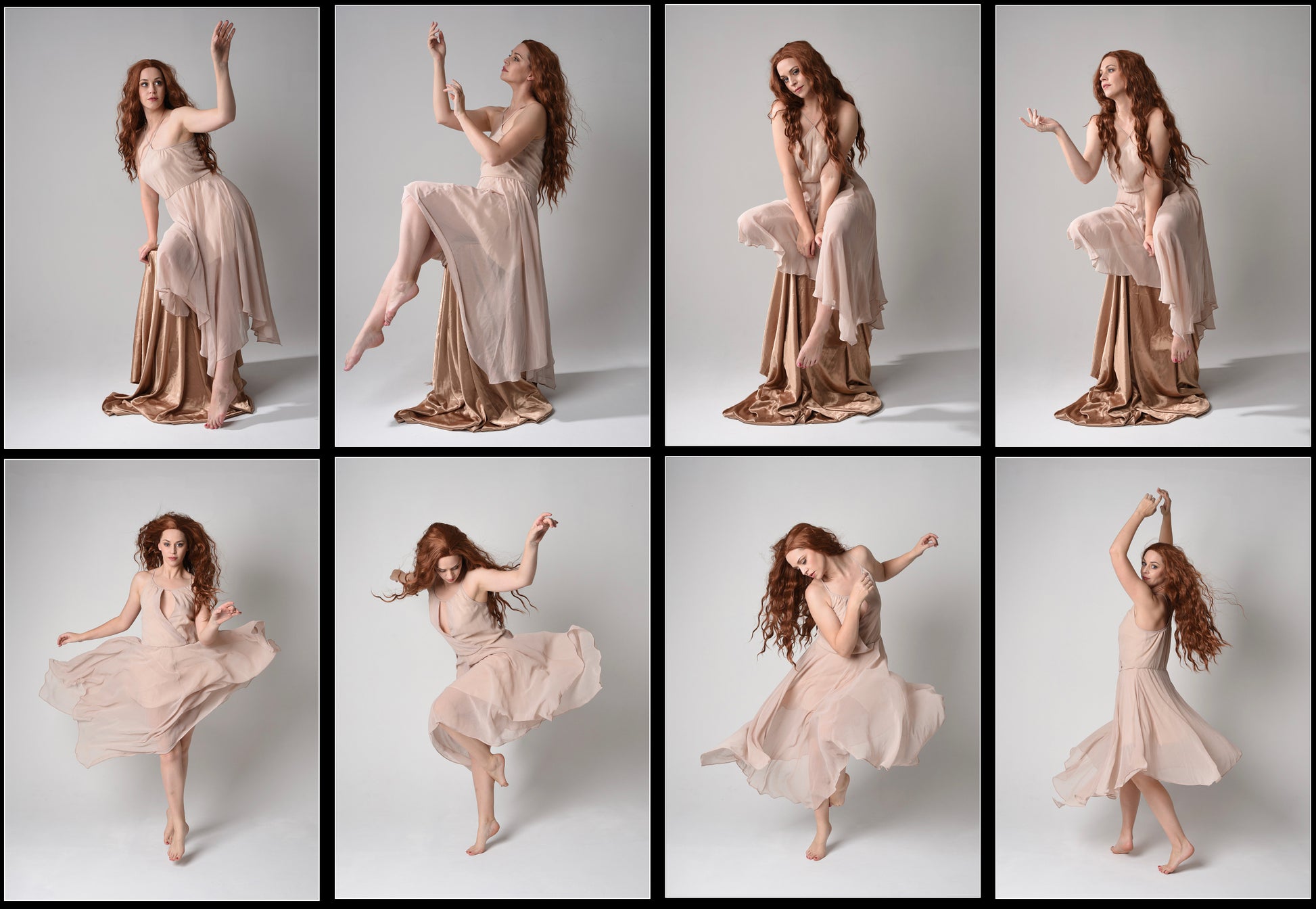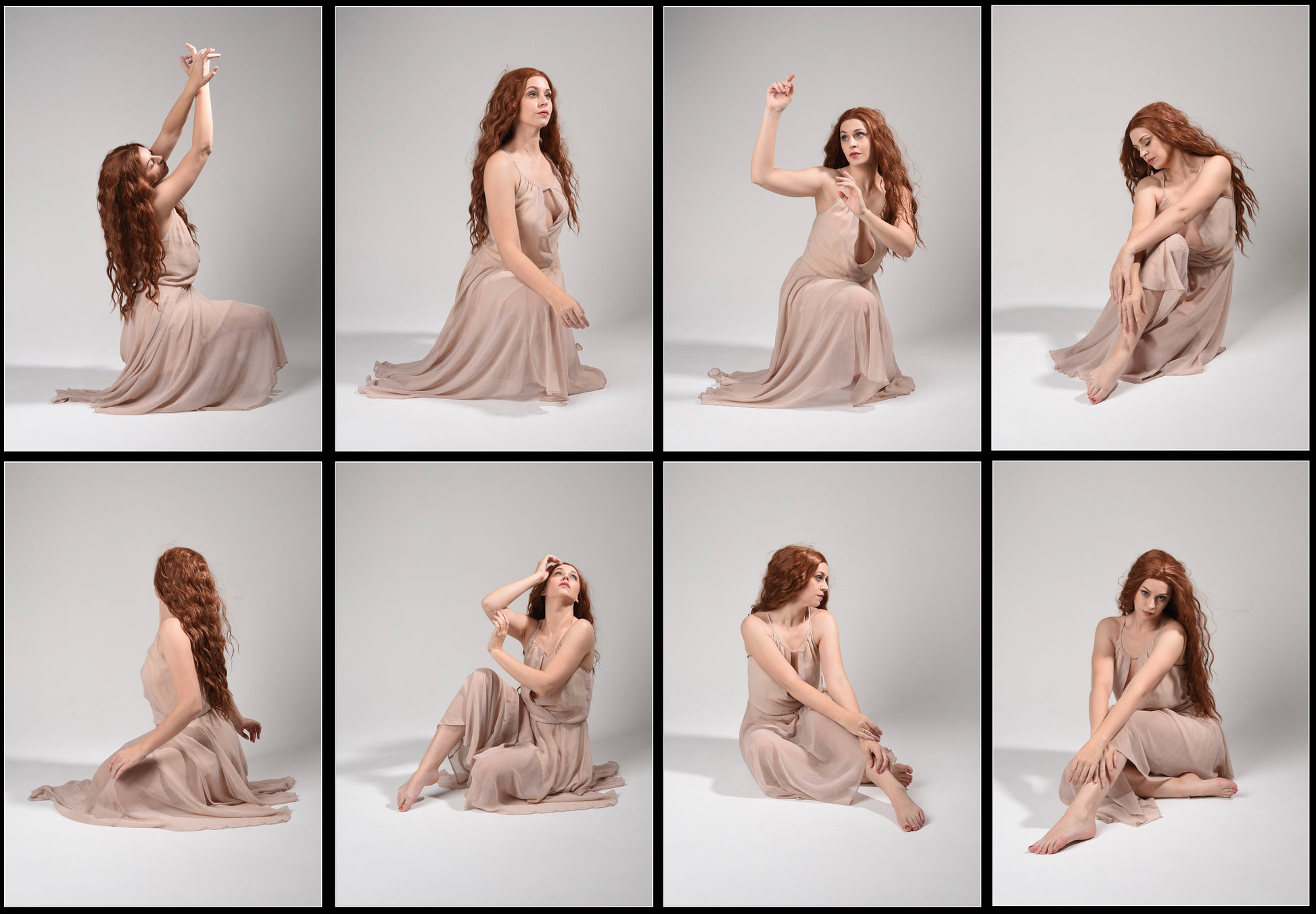 Wearing a flowing beige dress I tried to incorporate lots of twirling movement to give shape to the dress and hair with gestural arm poses.