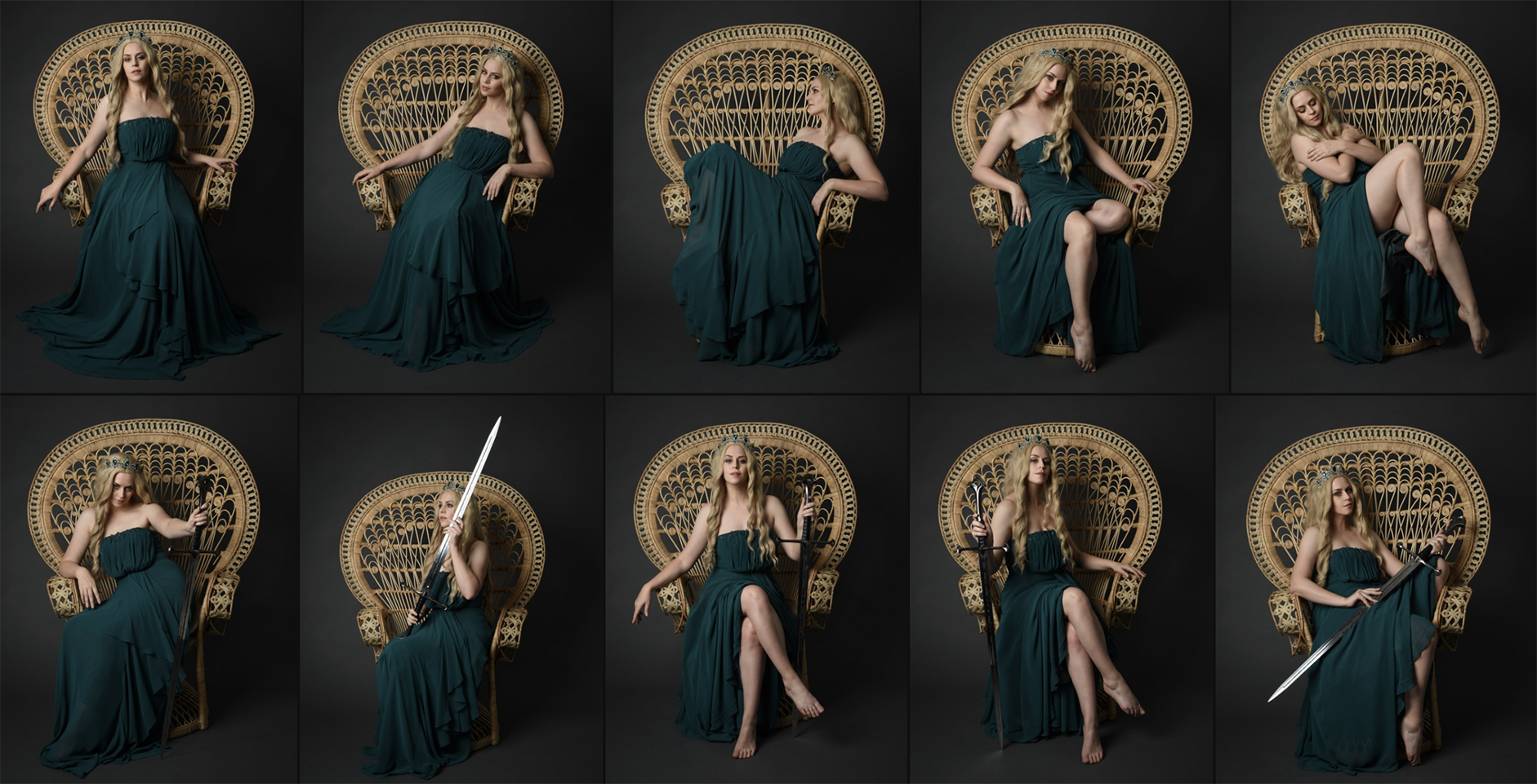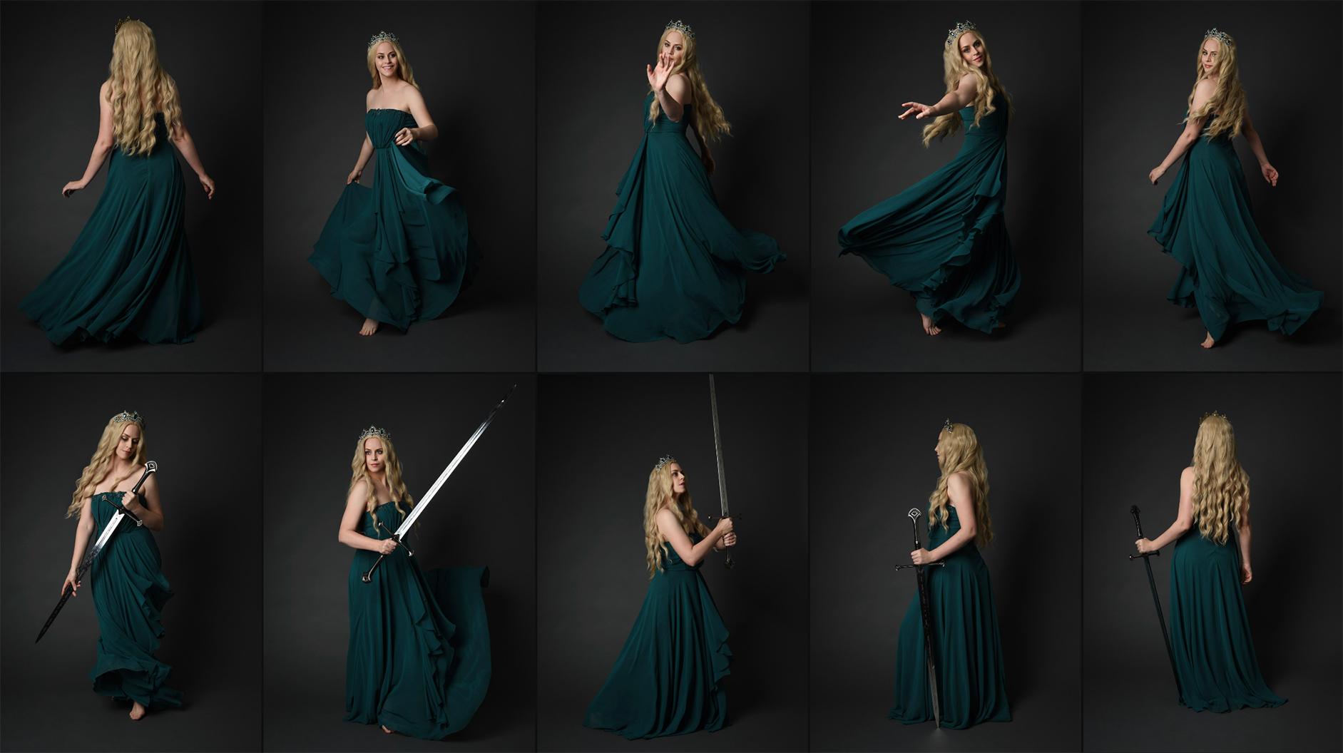 Featuring an elegant fantasy maiden on a moody grey studio background, styled in a rich green gown with flowing blonde hair and a fairytale-inspired crown for a magical, regal character. From poised and authoritative seated compositions to dynamic full-length movement welding a sword and ethereal close-up portraits.