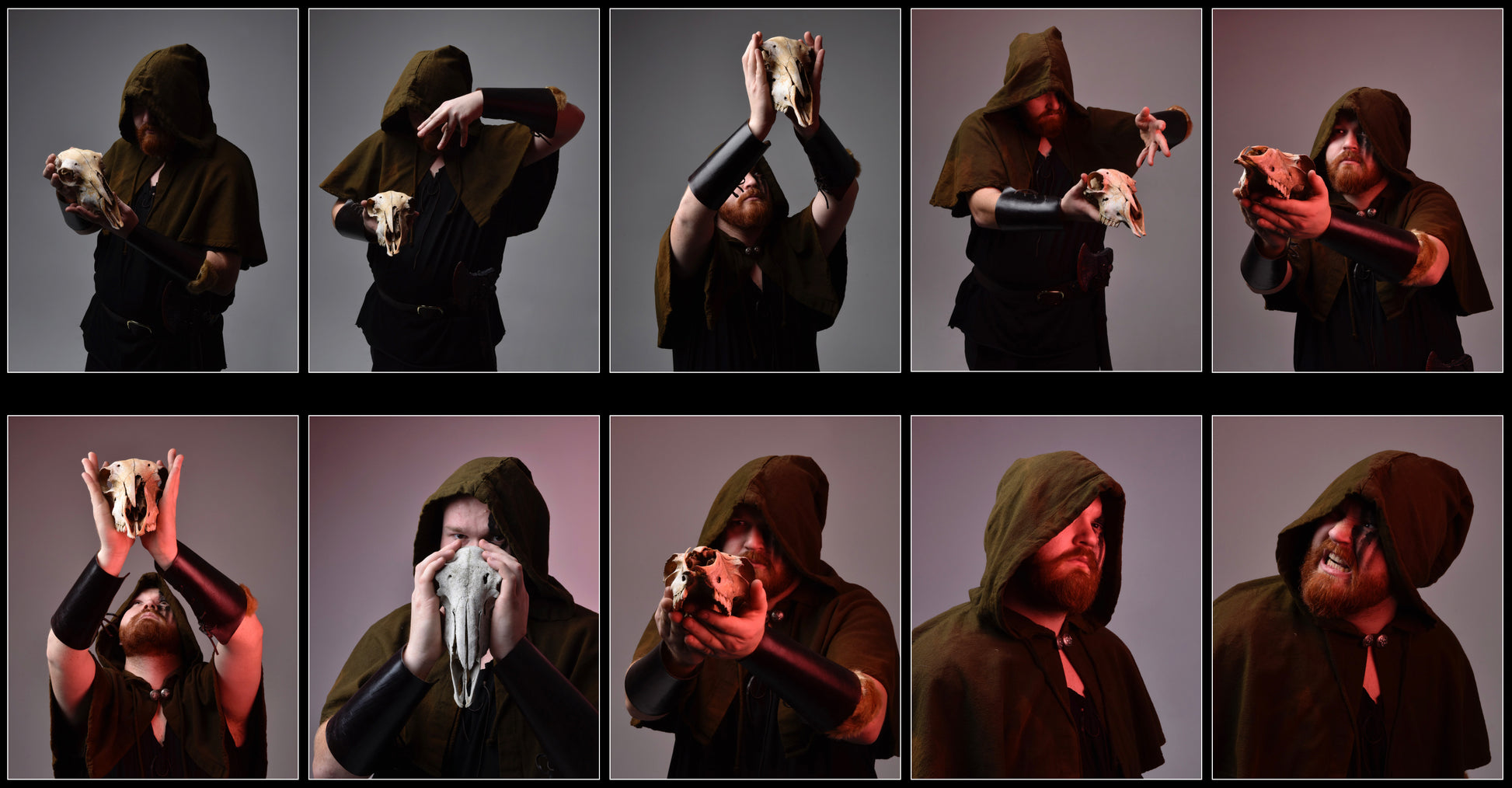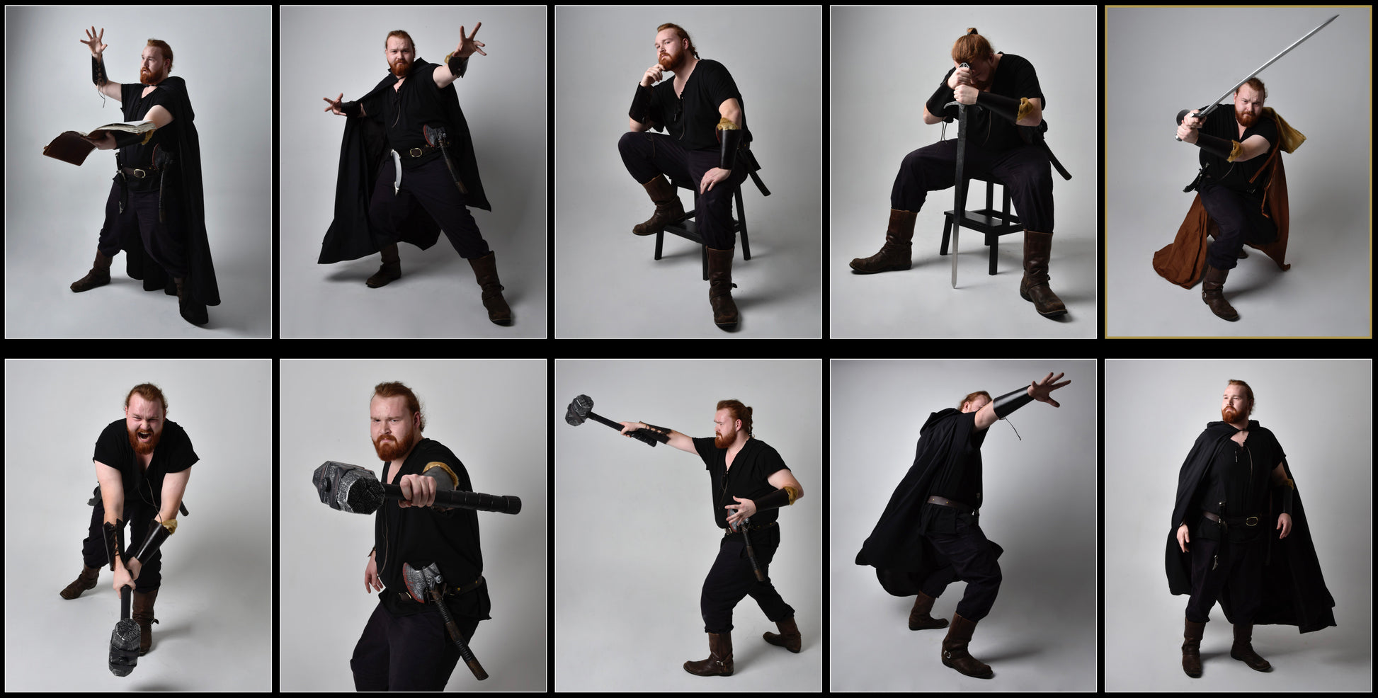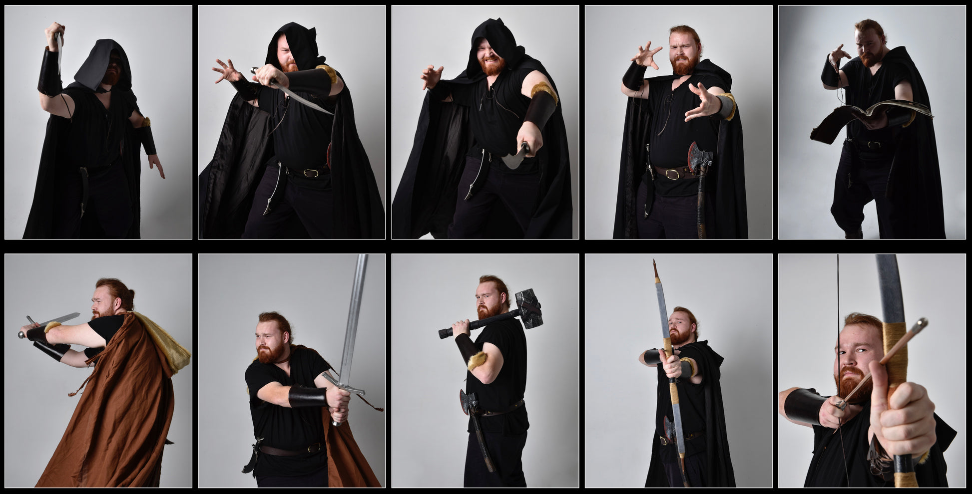 Max strikes powerful poses, wielding an assortment of props that include hooded cloaks, swords, knives, archery gear, and a formidable hammer, while his hands move with fluidity and purpose, weaving spells and engaging in epic battles of mystic might.