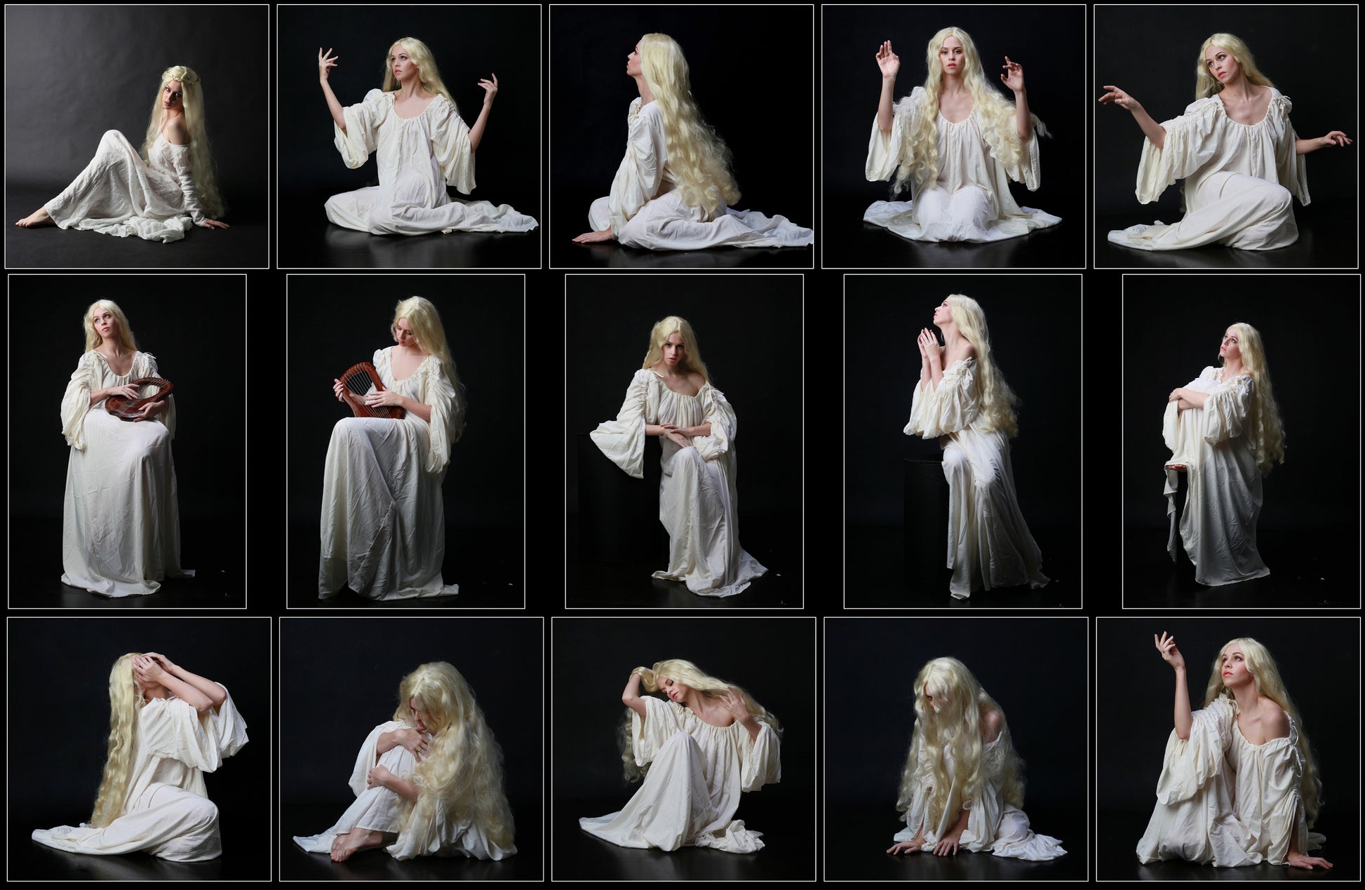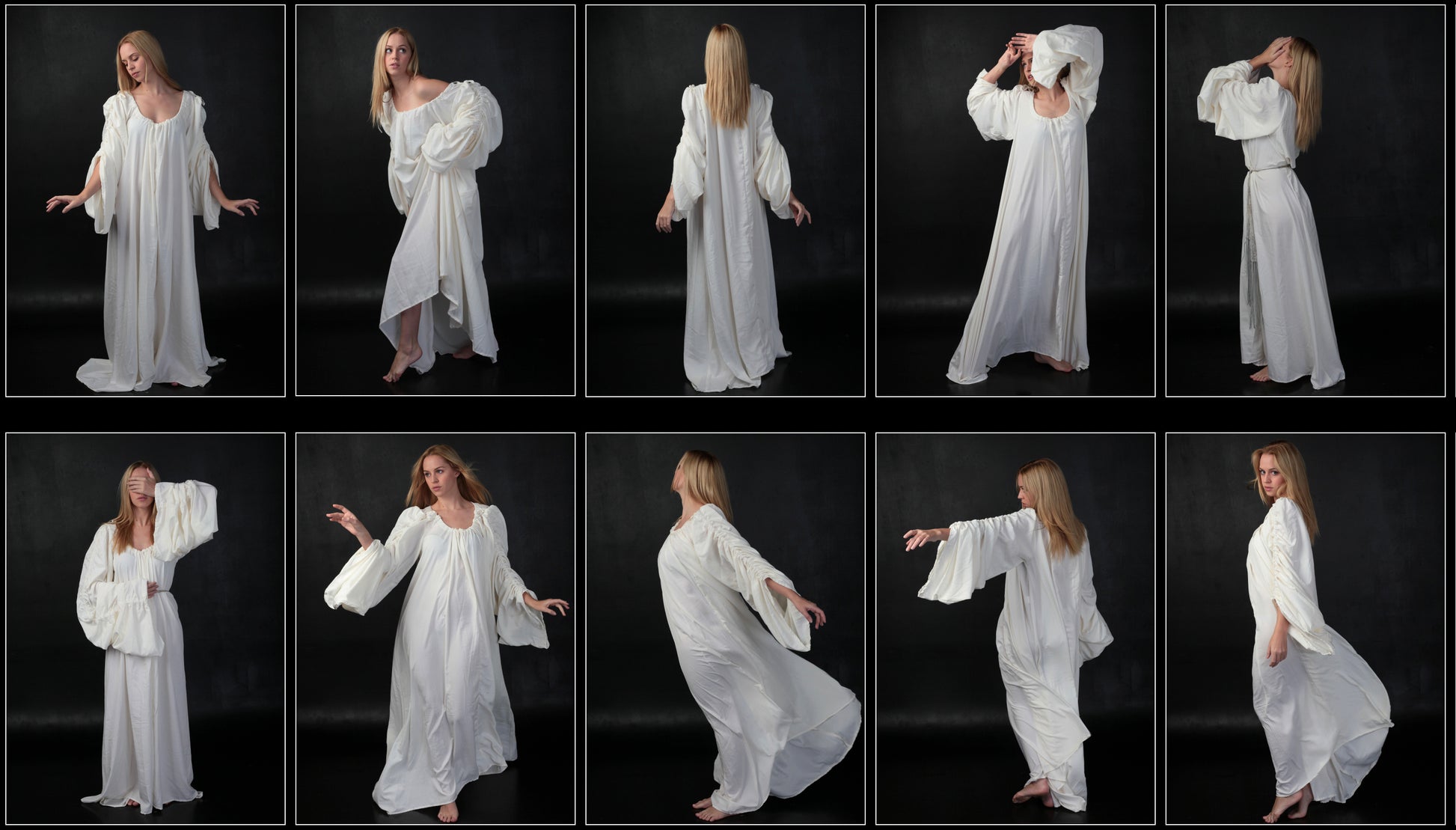 This pack includes haunting portraits with a dark and ghostly aesthetic wearing two white nightgowns on a dark studio background. Take on the role of a haunting ghost, the emotive gestures of an insane woman, or a figure from classical biblical painting in these high resolution studio portraits. This pack is perfect for painters studying fabric drapery and chiaroscuro portraits lighting.