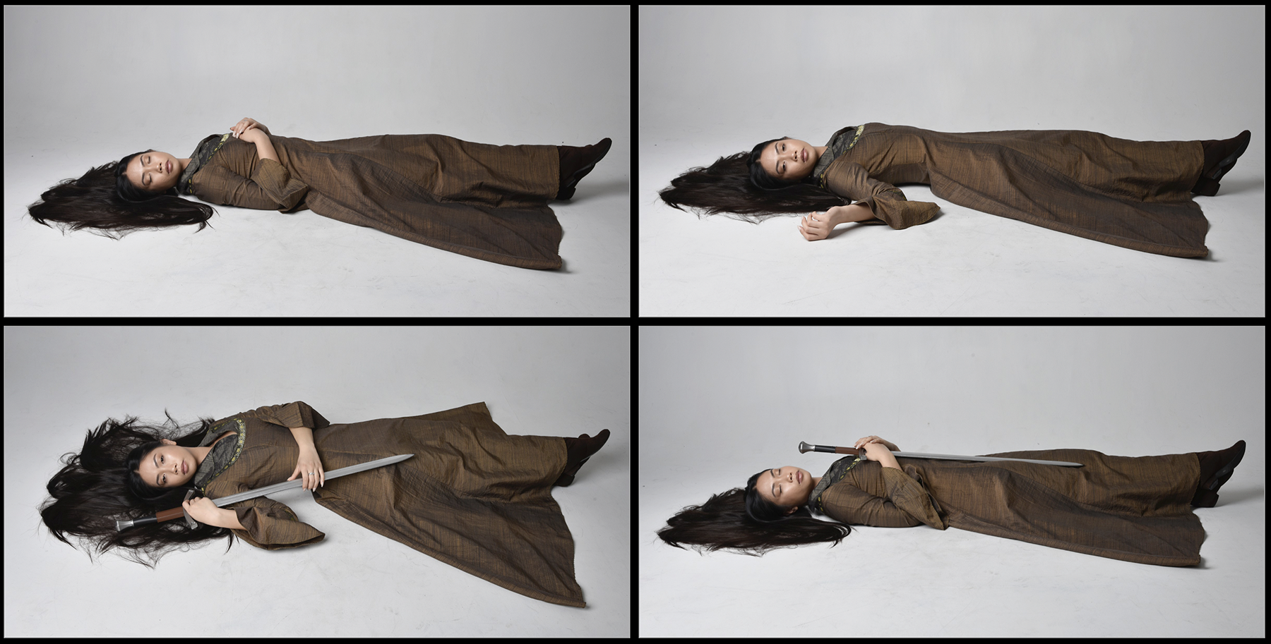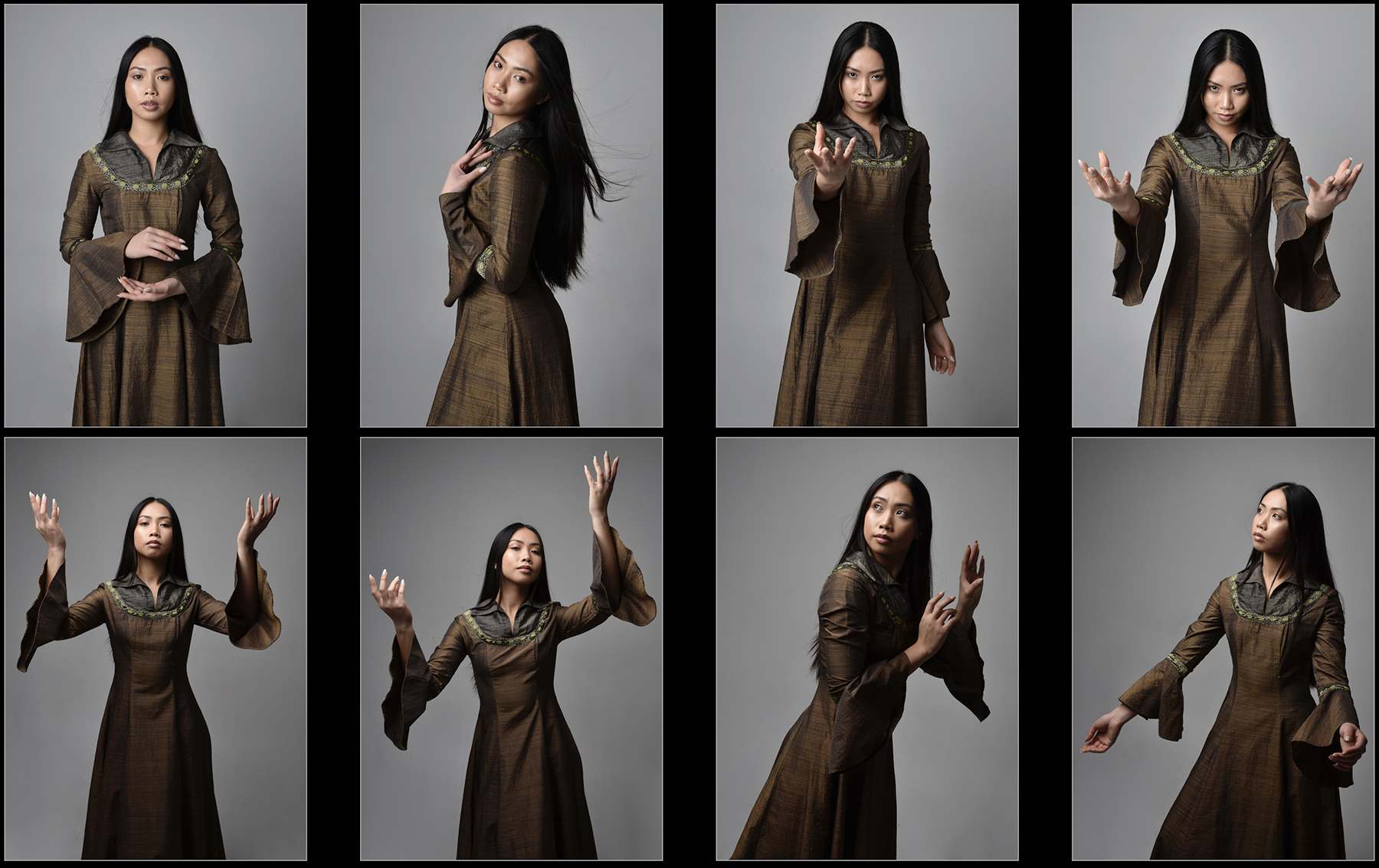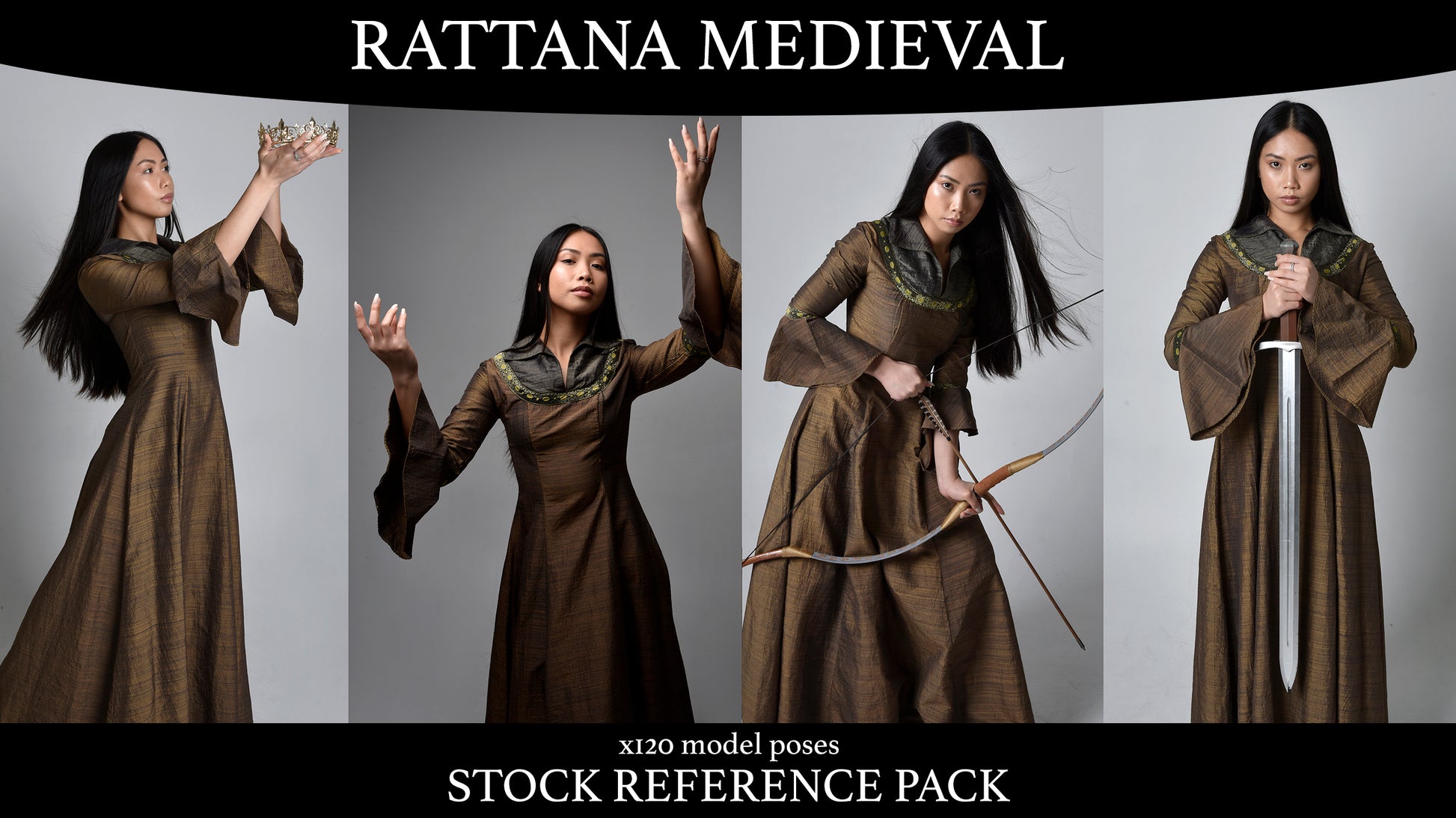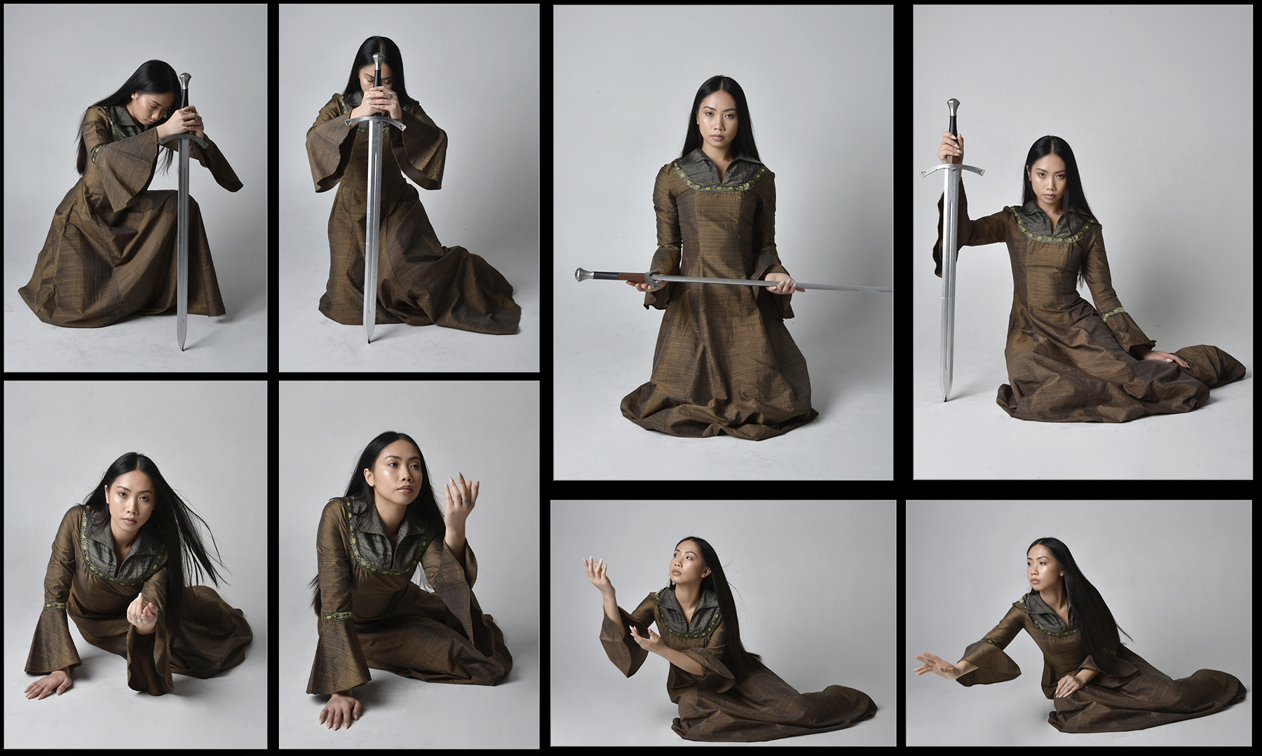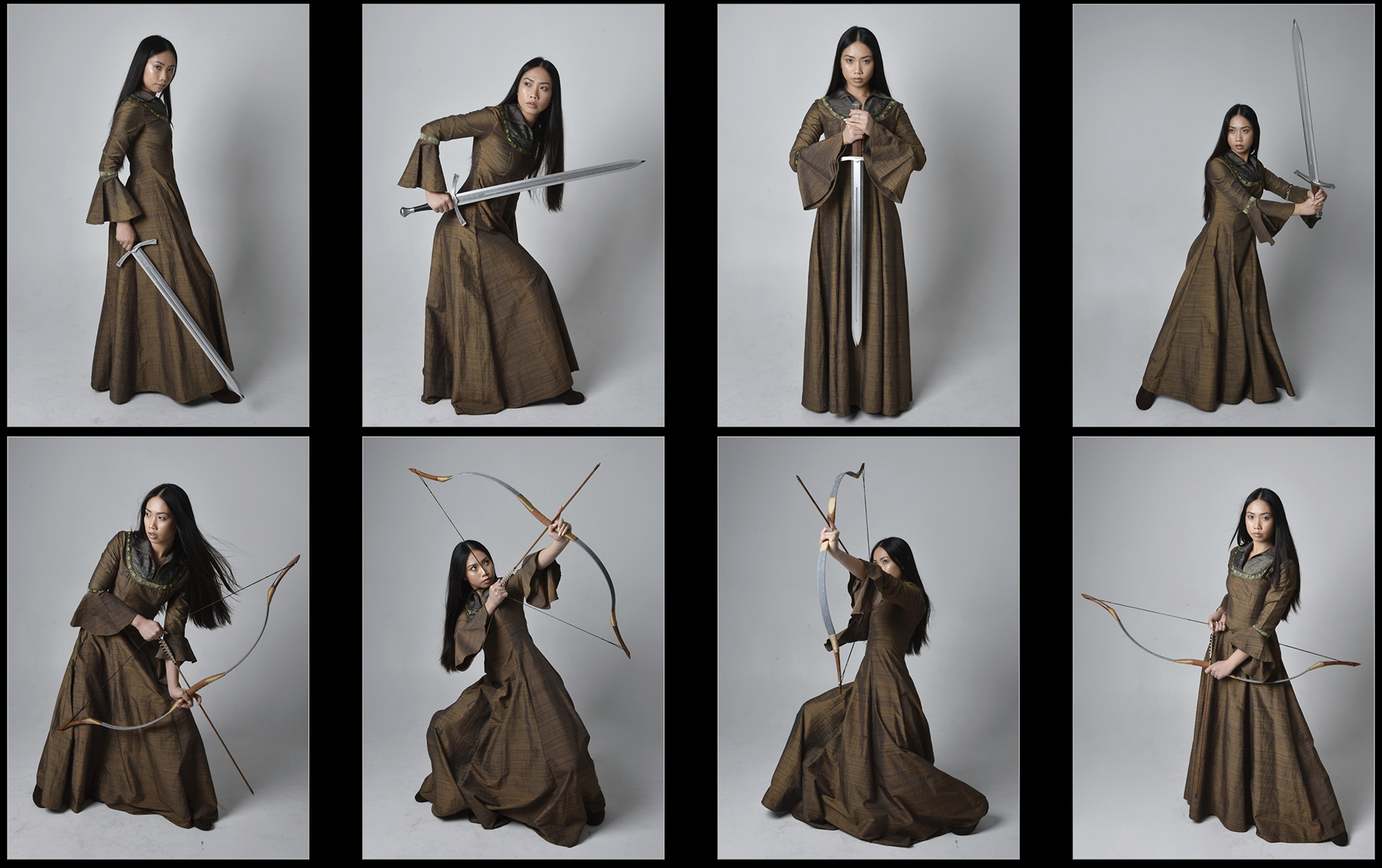 She is wearing a green medieval gown, This pack is perfect for creating epic fantasy characters, historical medieval artworks, and magical book cover designs. With a variety of weapons, including swords and archery, as well as crowns and magical hand gestures, you'll have everything you need to bring your vision to life.