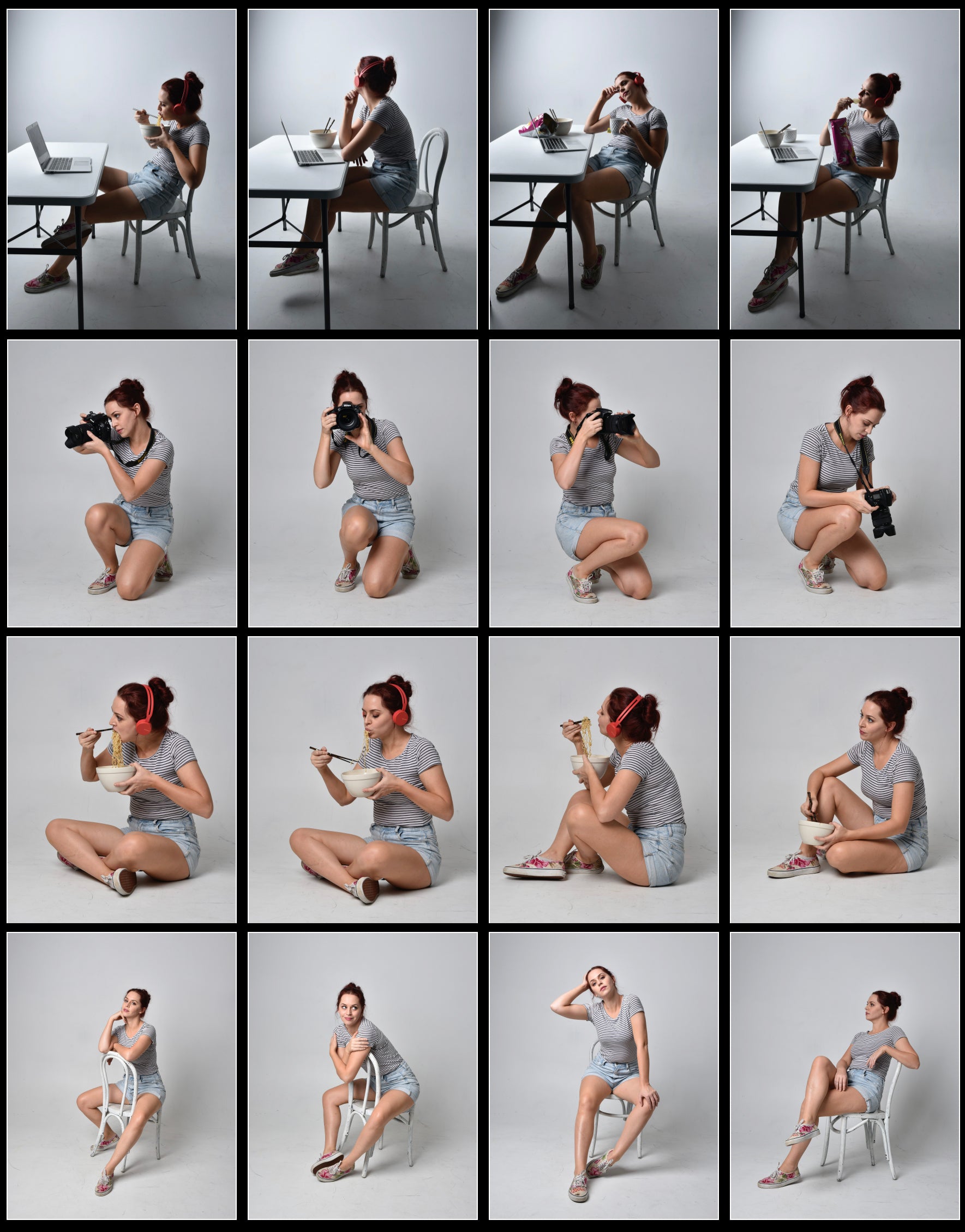Featuring a collection of realistic and relatable everyday activities captured in casual and natural poses, eating noodles and chips, walking around with a phone, taking photos with a camera and sitting on a chair. This product will inspire your characters to relax at home in a relatable way.