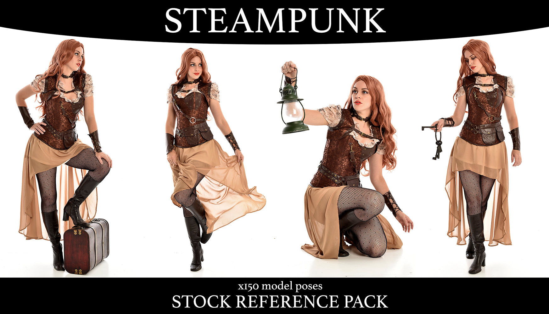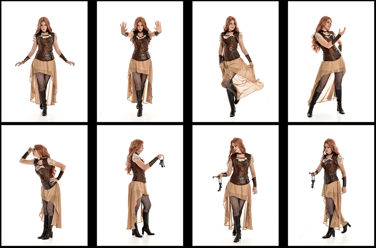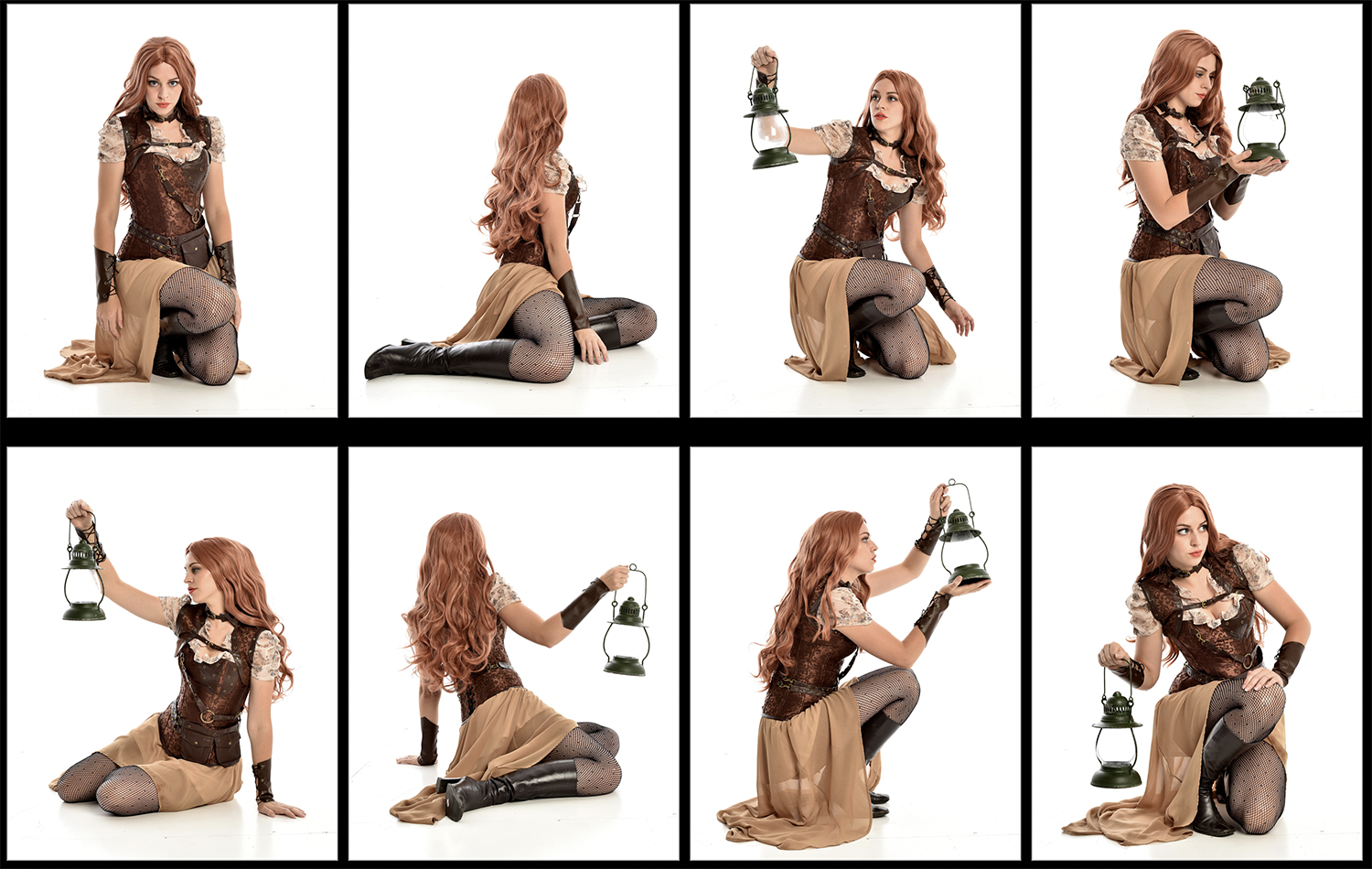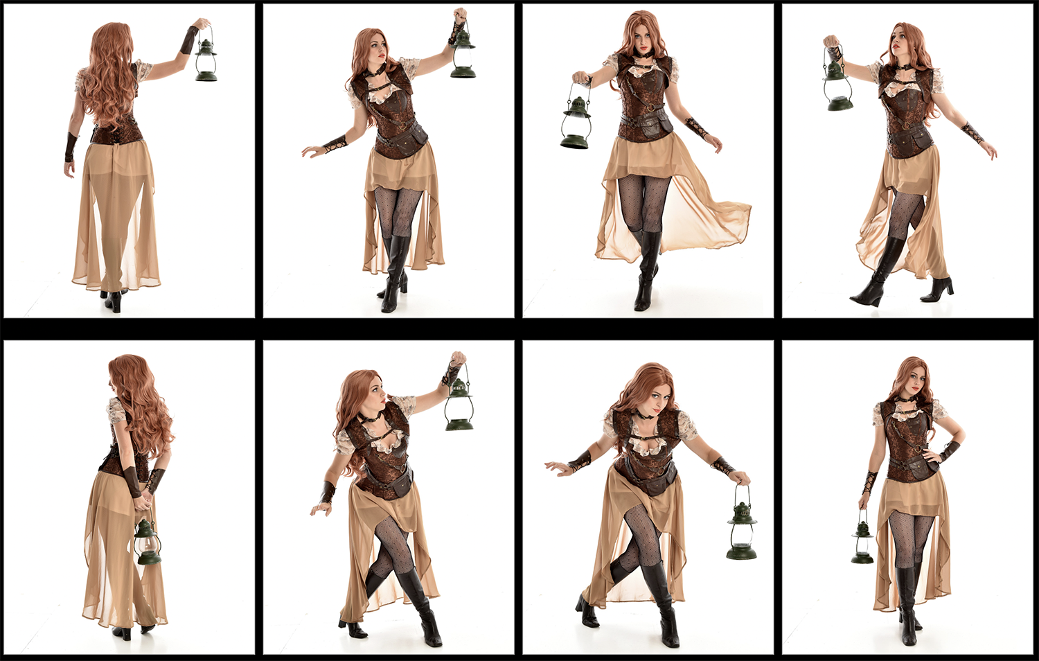 Each image is a self-portrait, capturing the essence of the classic steampunk aesthetic equipped with a lantern, telescope necklace, and keys for props. Embrace the spirit of dystopian adventure and elevate your artwork with this inspired by the steampunk character.