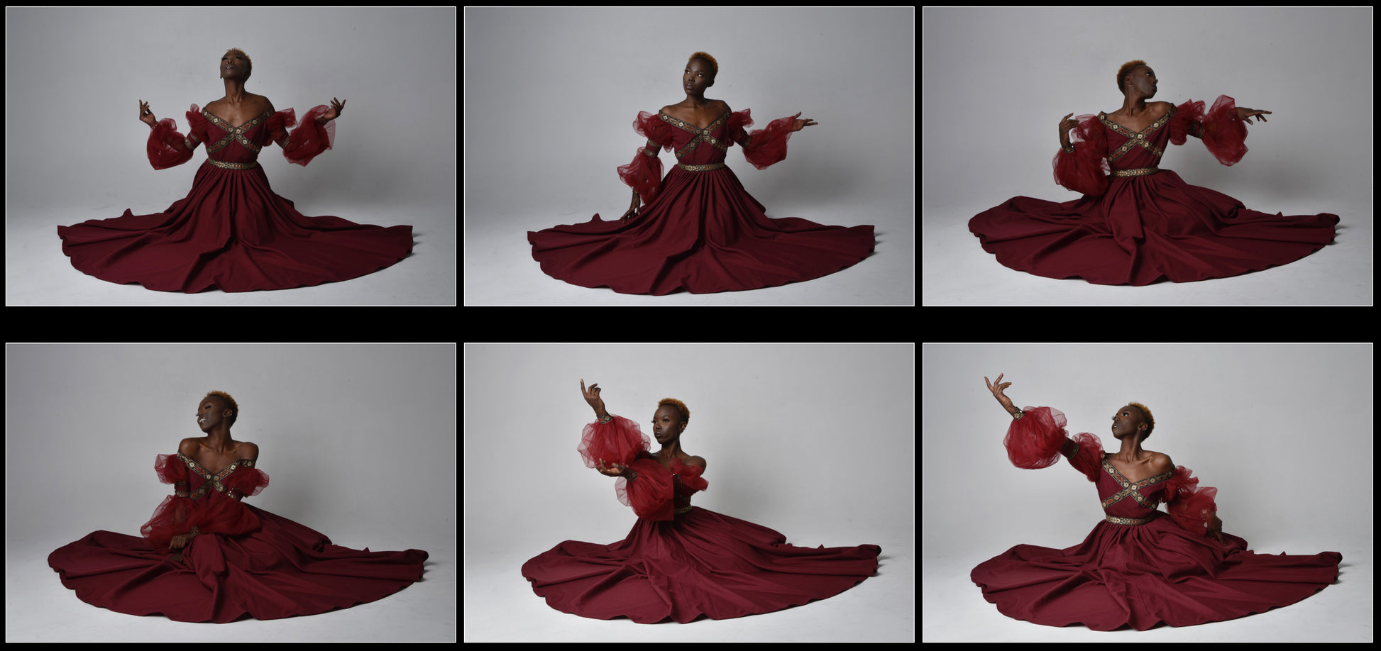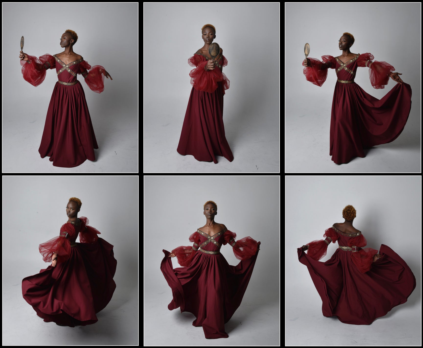 Stella in wearing a beautiful renaissance style red gown with lots of twirling and dancing poses to show off the flowing fabric.