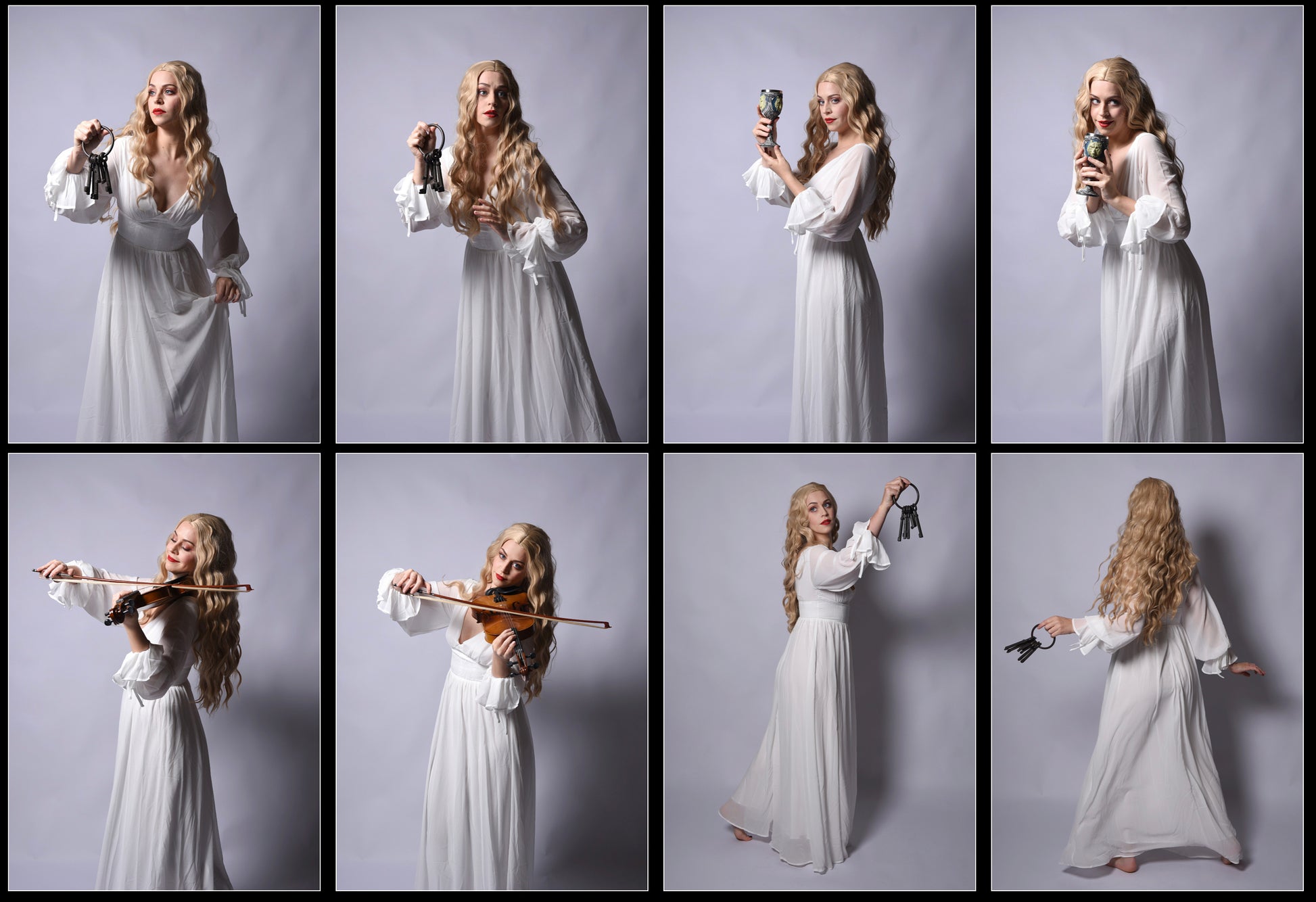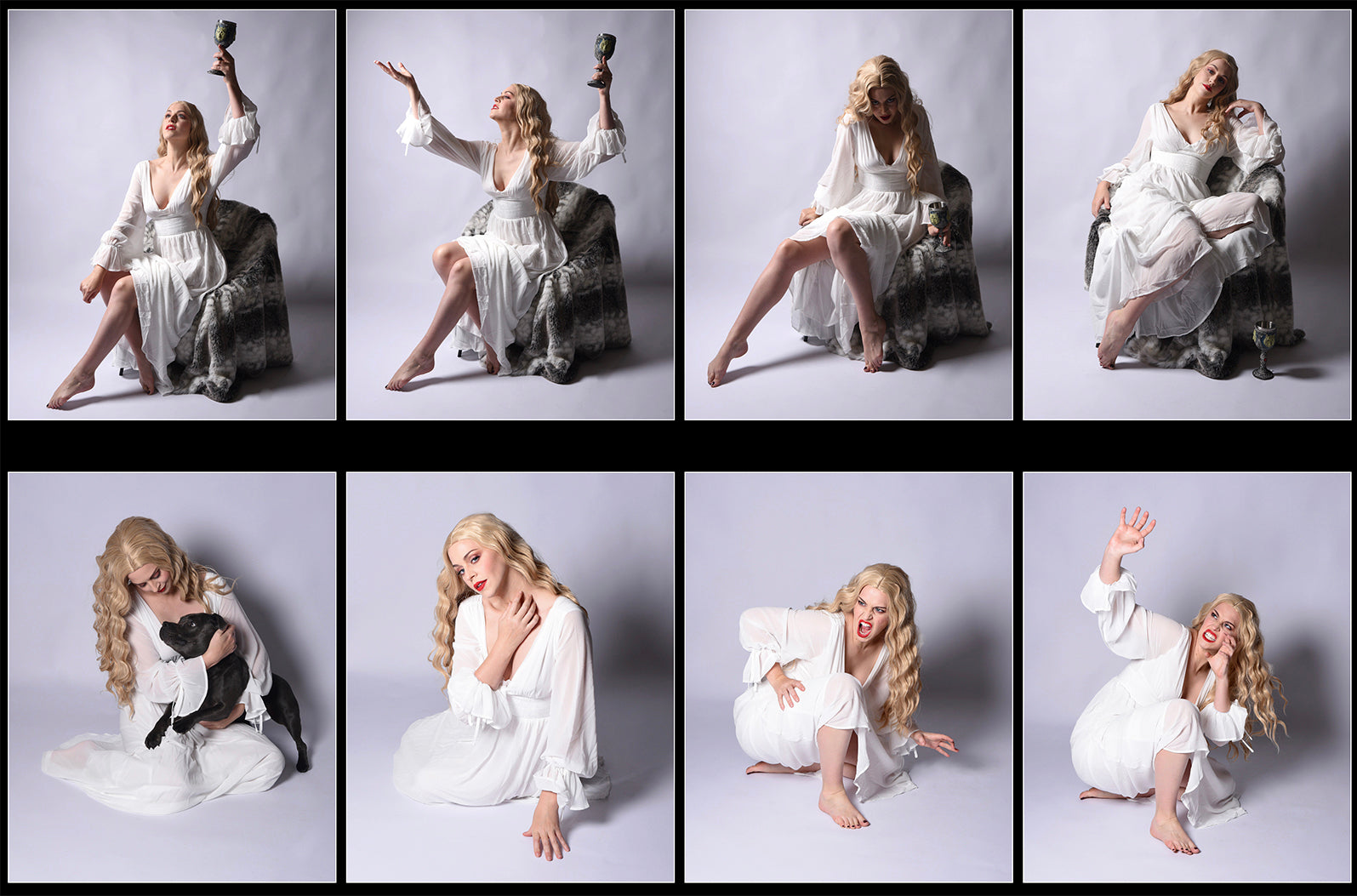 x150 high resolution self portraits (featuring a cameo with my dog Nyx) dressed in a vintage white gown, inspired by vampire brides from classic horror stories, perfect for your next gothic artwork for Halloween.